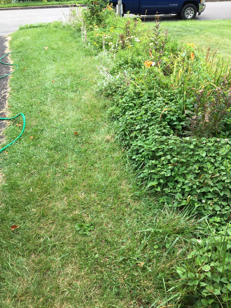 Extended initial attempt at a bed embedded in a lawn by creating a berm from excavated turf and filling with homeowner supplied mulch. Then, planted using homeowner supplied plants