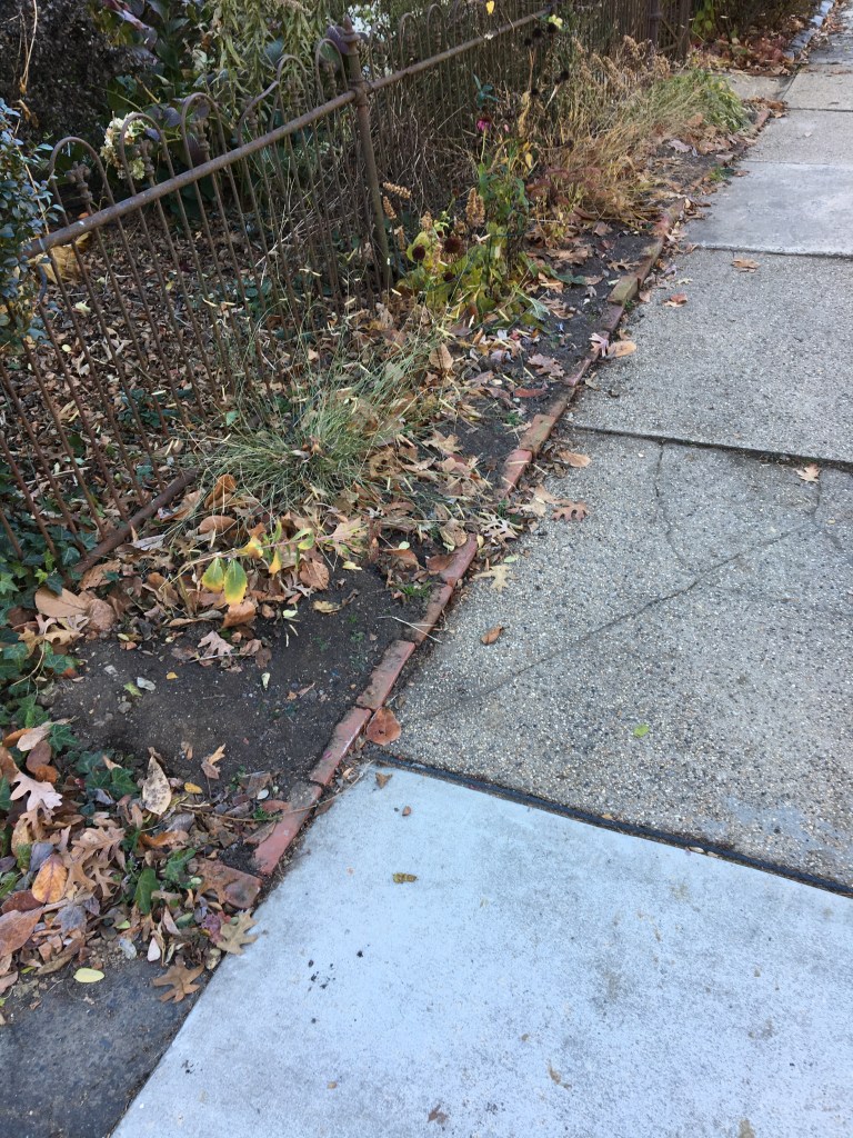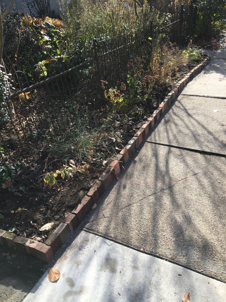 Used pre-existing brick rotated and salvaged brick rotated vertically to create higher border with improved soil retention and visibility