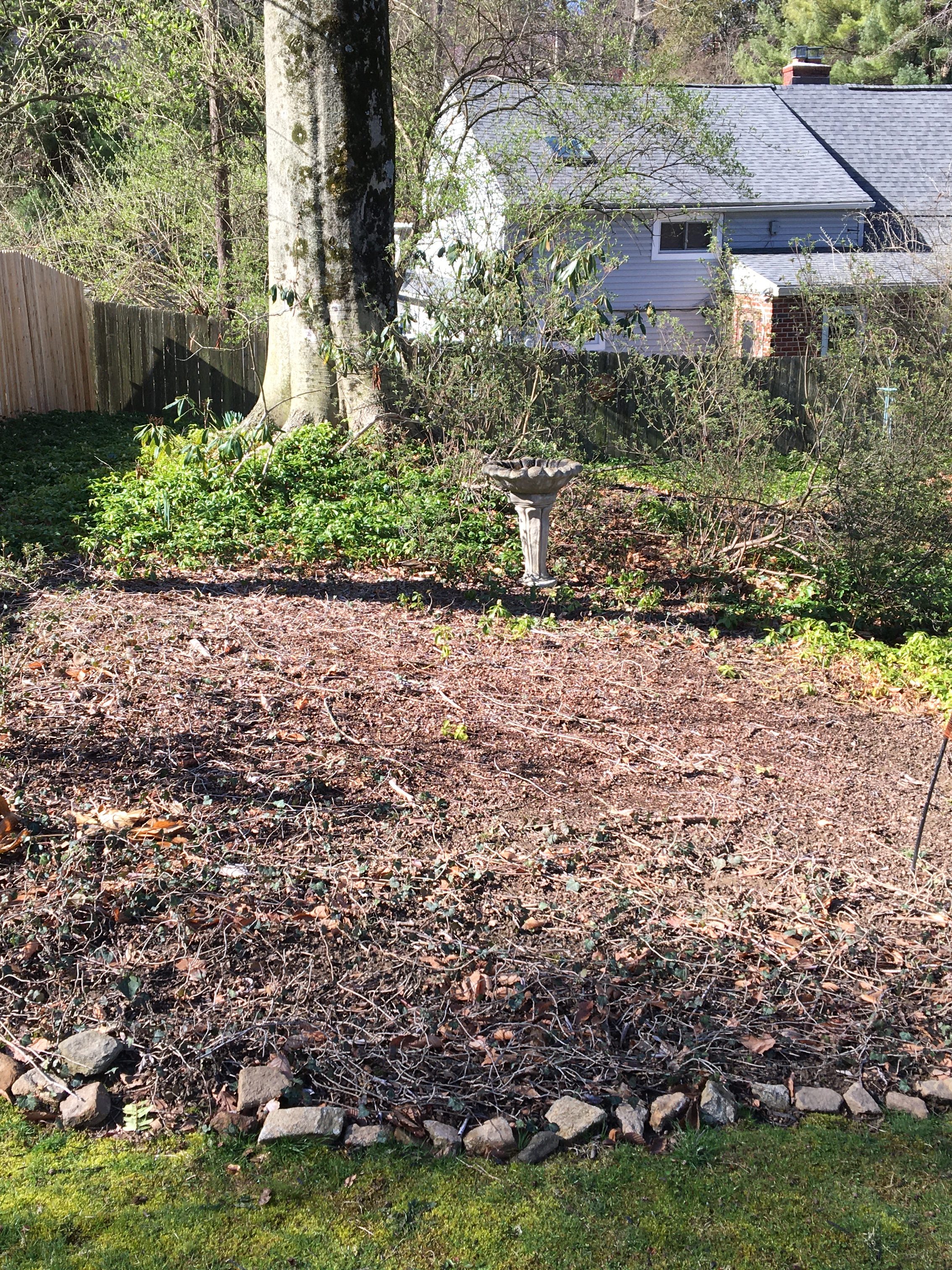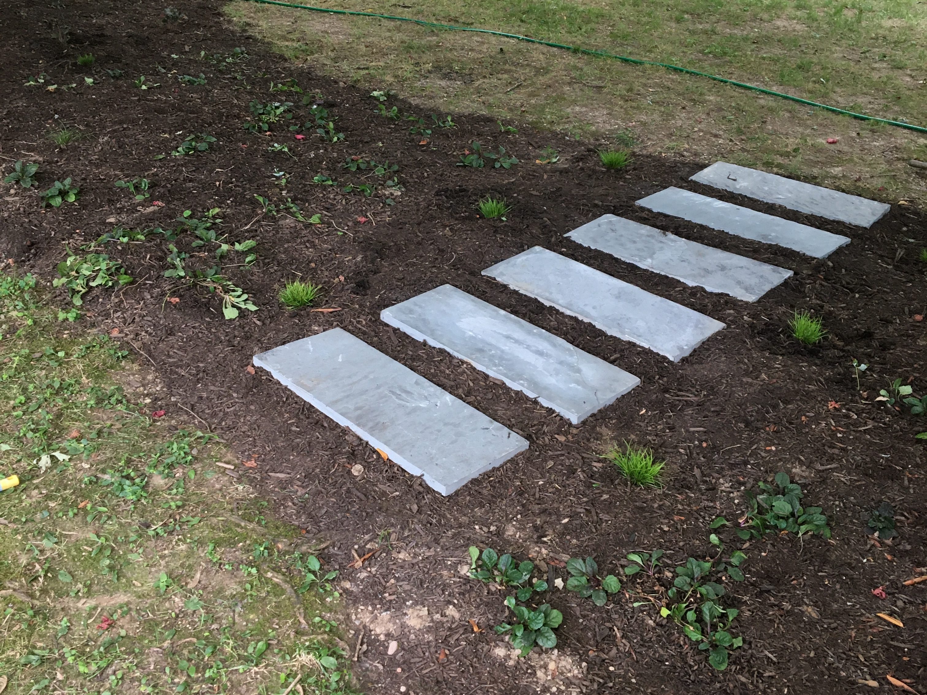 Dog relocated to other chew toy, installed edge, relocated grass and removed weeds, removed pebbles from pre-existing topsoil, applied mushroom compost, applied brown shredded bark mulch, planted 20 ferns, 35 sedges, 30 heuchera and 20 bugleweed, laid flagstone path connecting lawns near house