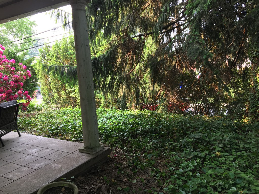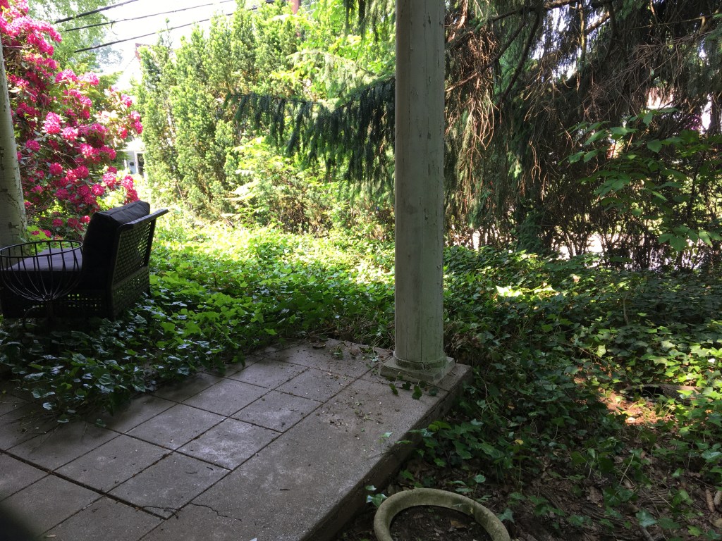 Pruned ivy along patio, removed wineberry along arborvitae hedge and removed ivy from rhododendron