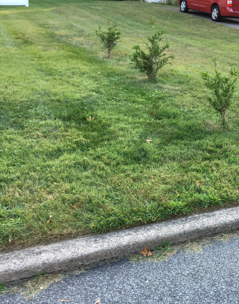 - As you can see in Pic 1, when planting small woody plants in a lawn, grass growing right next to the plants will be growing as tall or taller. This reduces nutrient uptake by your woody plant, slows growth and makes growing to maturity much l-o-n-g-e-r. Also, when you weedwhack around the young tree, you can potentially nick the bark and kill it (see the bare yellow spots in the back of the tree row? Those were former little trees). Ouch! Mulching helps to keep weeds/ grass from growing while eliminating the need to weedwhack up to the tree, giving it the best chance of survival.
