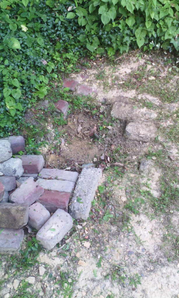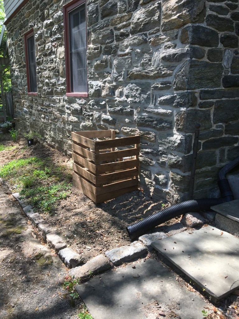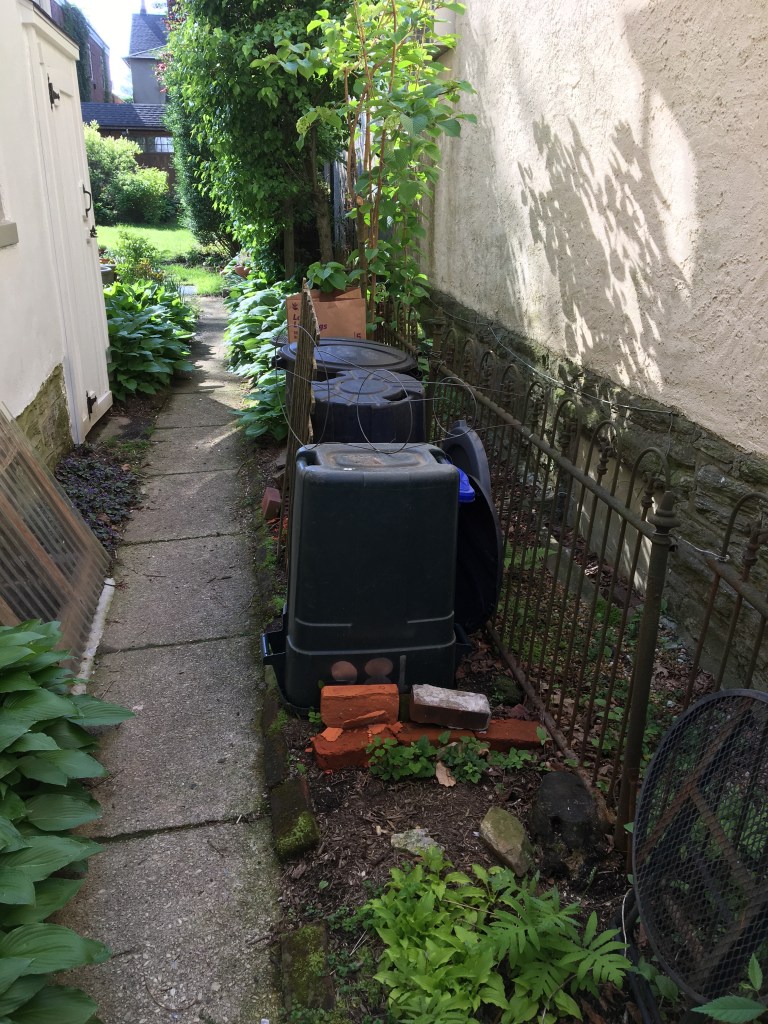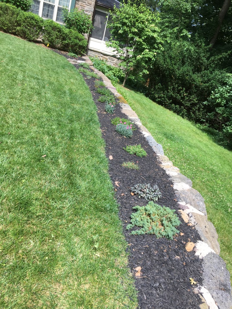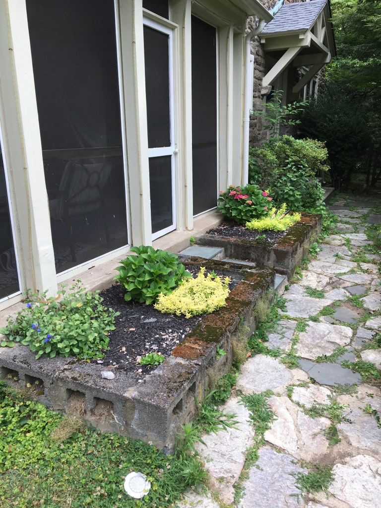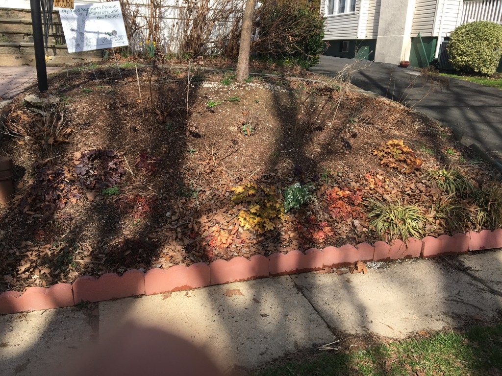 Created swale and planted homeowner supplied natives and perennials Before Cut edge, mulched, planted creeping juniper, phlox, dianthus, sedum and bearberry before Cut edge and sheet mulched before Shifted bricks to a vertical position and added more bricks to create raised bed before Created tiered raised bed from masonry pieces leftover on homeowner’s site, then planted thyme, lavender, mint, cardinal flower, sage before aerated soil, added topsoil and organic amendments, seeded before