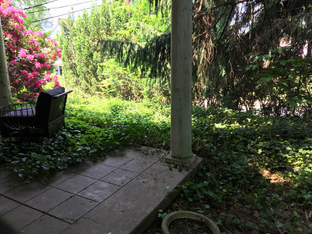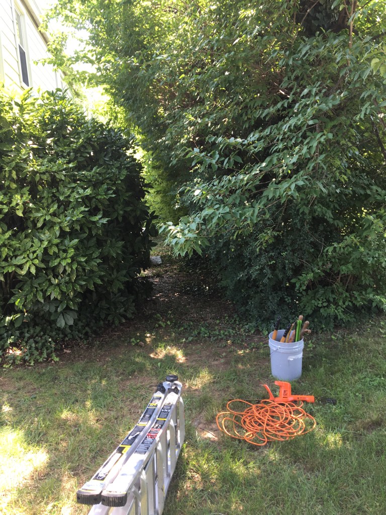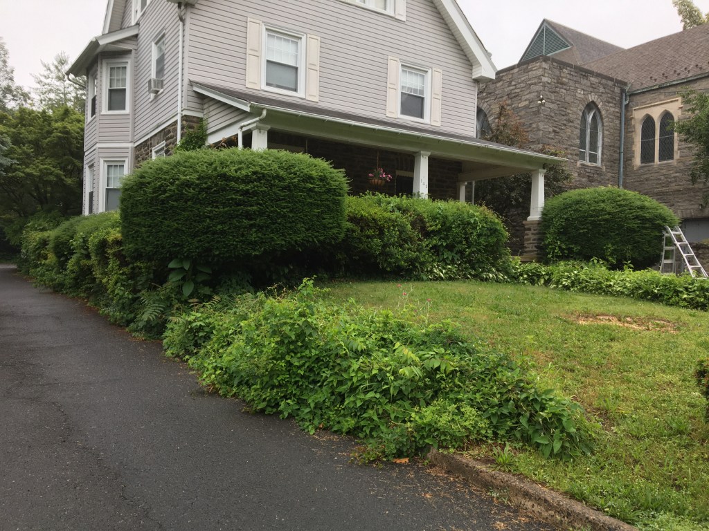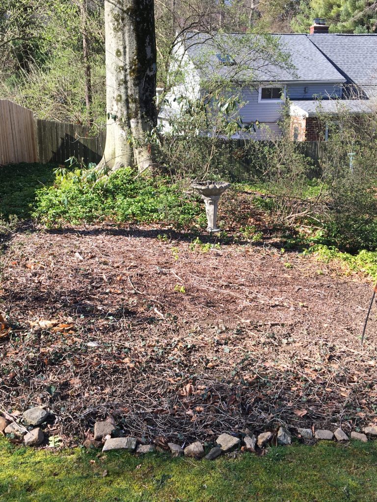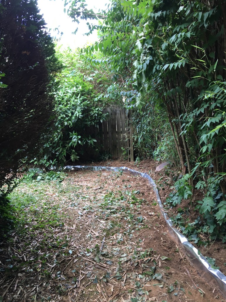 Removed ivy, wineberry and porcelainberry before Pruned Aucuba, mock orange, honeysuckle and privet before Removed oriental bittersweet from Siberian elm before Removed some bamboo and installed barrier per client’s request (Aluminum is visible because border slopes up from path) before Removed Canadian thistle before Removed side limb from arborvitae. No one died before