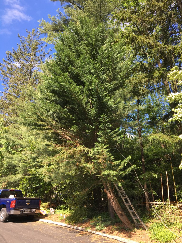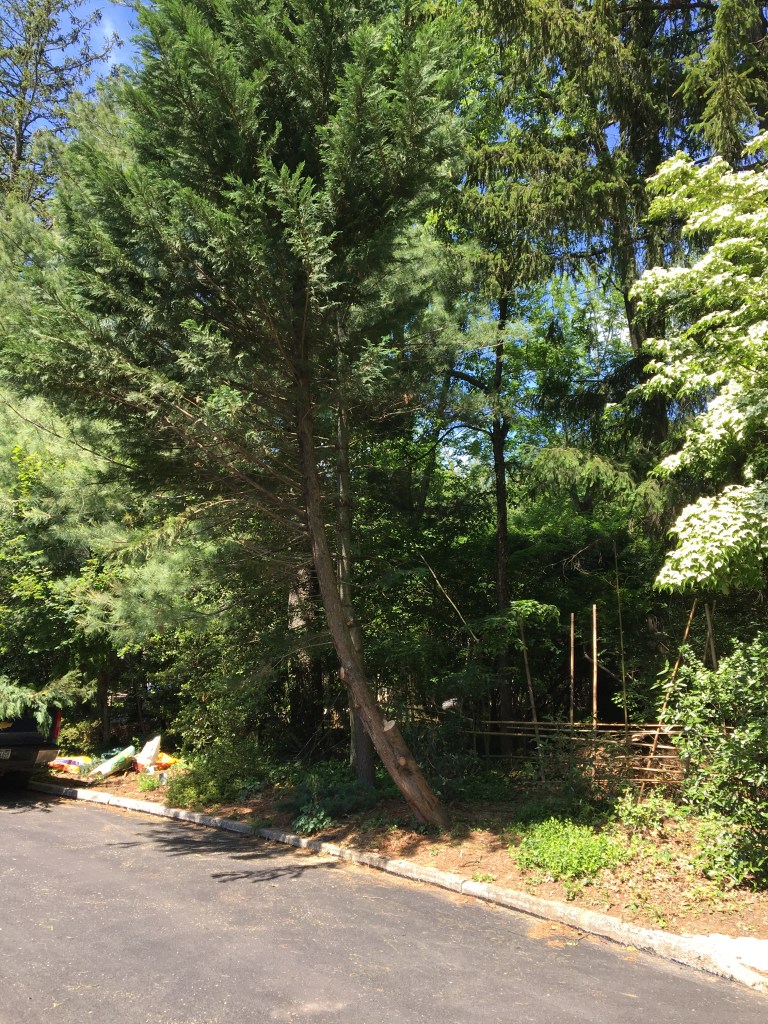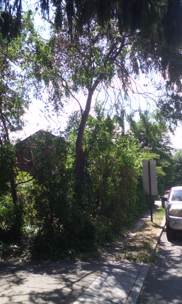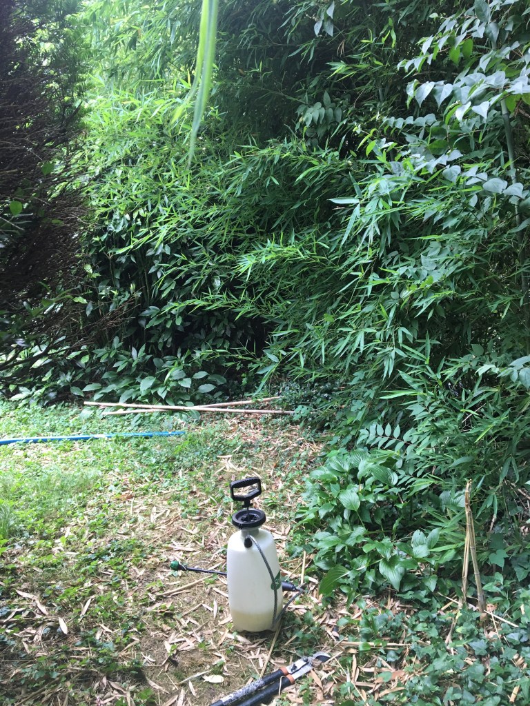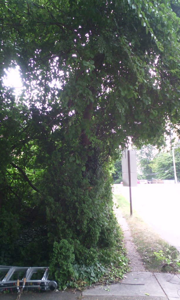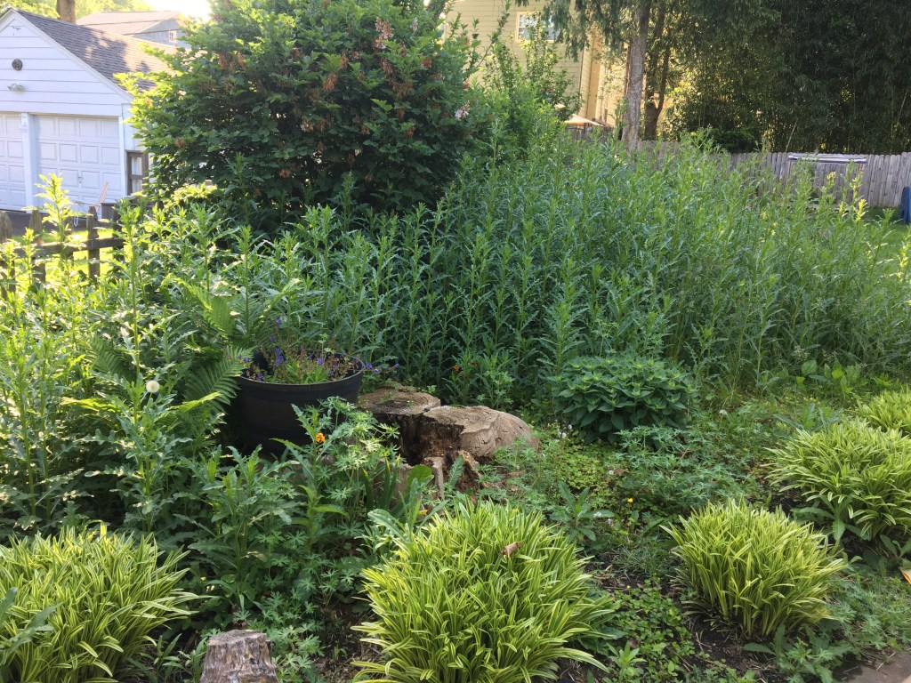 Removed ivy, wineberry and porcelainberry before Pruned Aucuba, mock orange, honeysuckle and privet before Removed oriental bittersweet from Siberian elm before Removed some bamboo and installed barrier per client’s request (Aluminum is visible because border slopes up from path) before Removed Canadian thistle before Removed side limb from arborvitae. No one died before