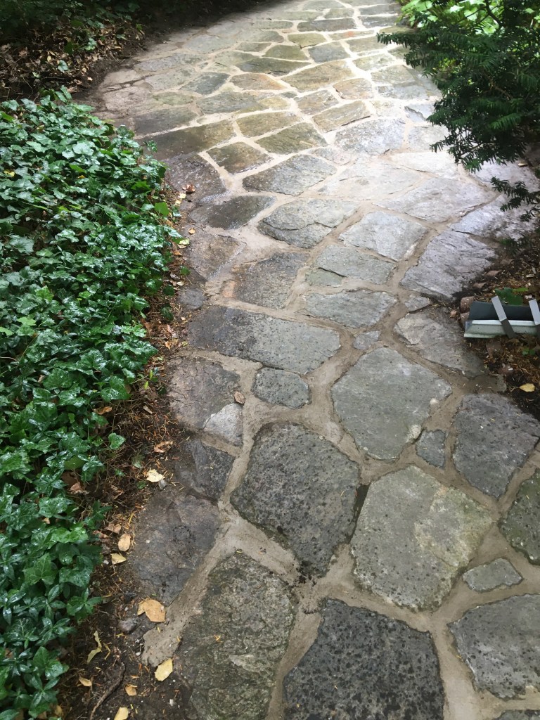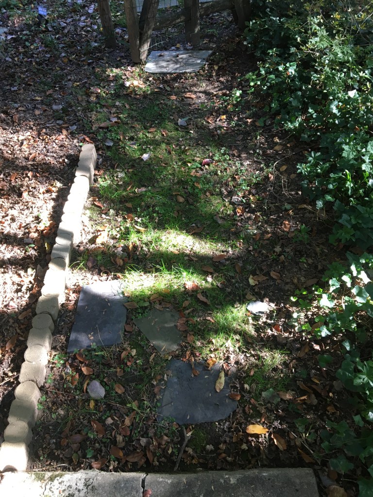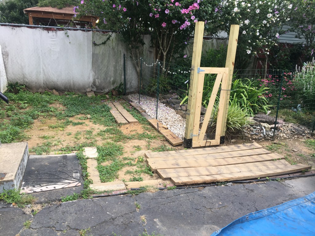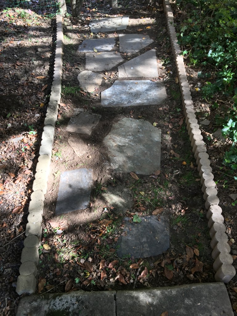 installed veneer stone and travertine tile cap to raised bed before installed salvaged travertine paver path before Installed landscape timbers, weeded and applied new gravel extended side border and installed more walking stones in path before removed weed infested marble chips, reapplied weed barrier, applied crushed rock before repointed flagstone walkway before Installed masonry bricks with refractory cement as mortar installed walking stone path before Installed masonry paver patio with sustainable drainage to replace previous deck before