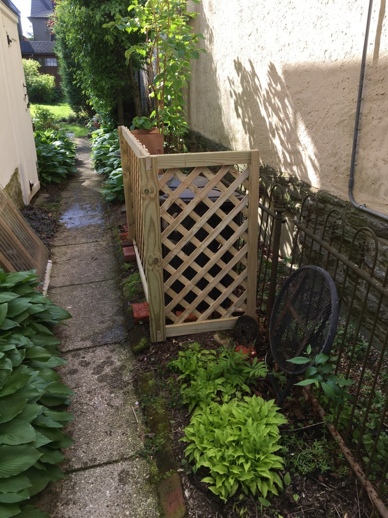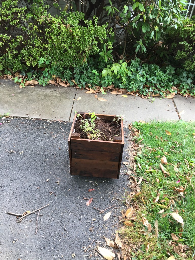 Trash can screen before utility meter screen (made from a pallet!) before bringing to homeowner Pallet made planter with heuchera, sage, lamium before filling with plants custom-made garden signs, stained and coated in polyurethane what it looks like in the site Shelf made from pallets Garden screen made from a polyurethane-coated planter Planted salvia, lamb’s ear, creeping jenny, sedum, creeping thyme, scaviosa before planters planted