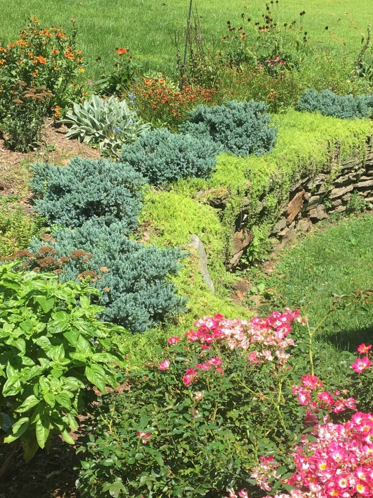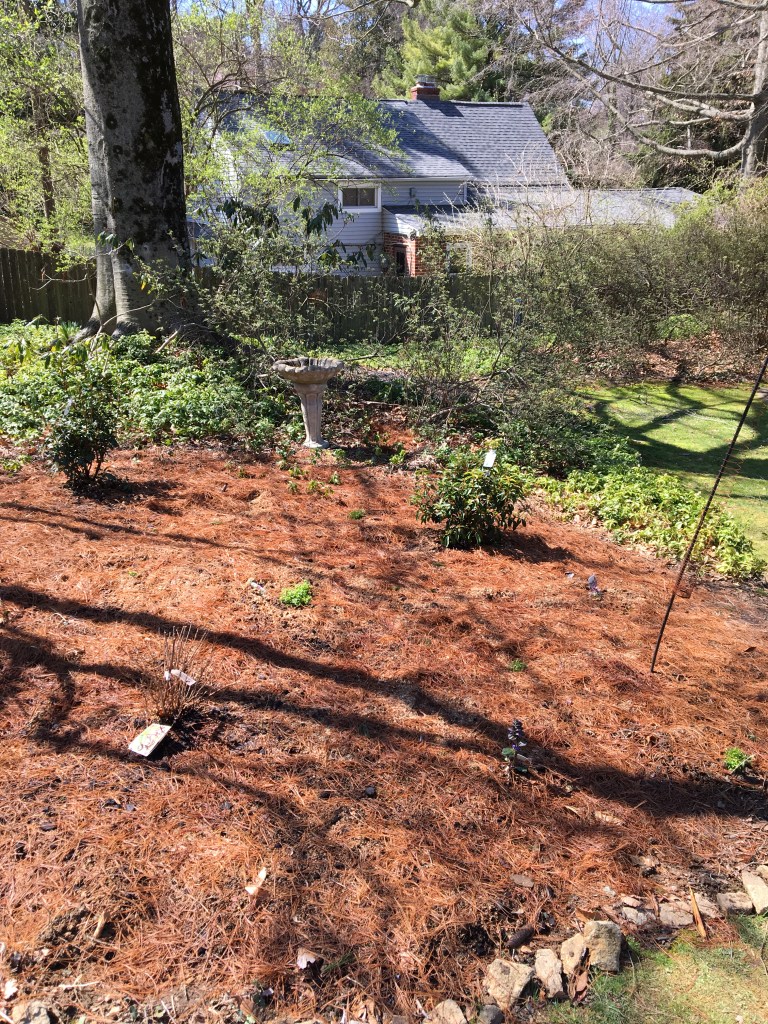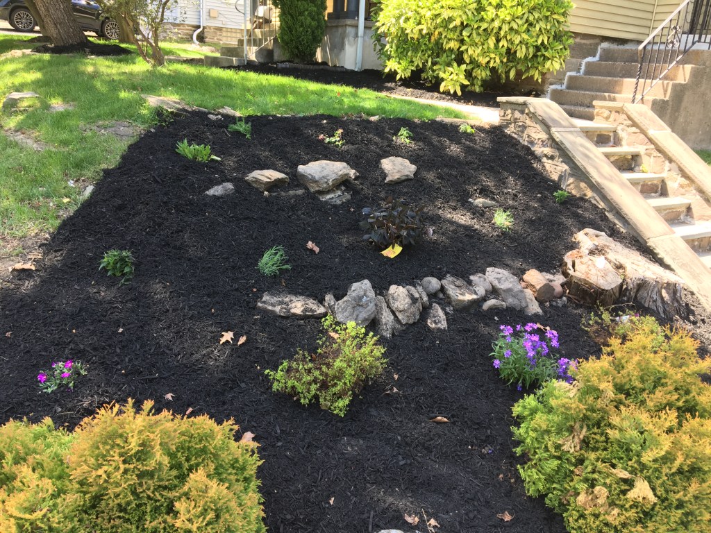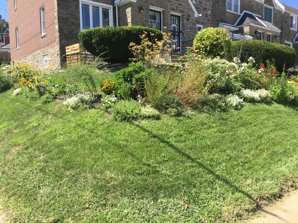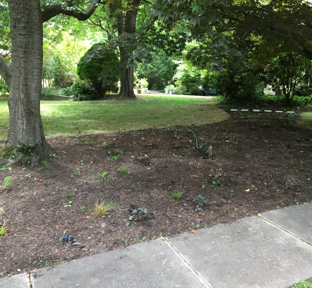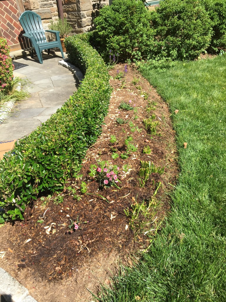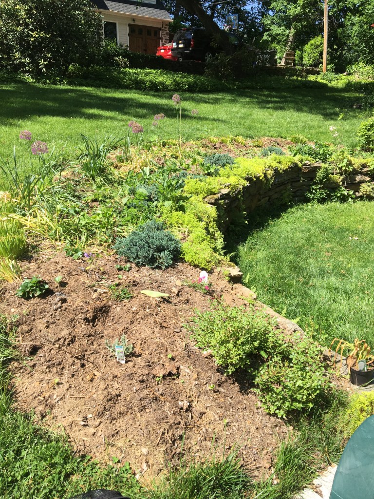 planted heuchera, ajuga, carex pensylvanica and lady fern while installing a flagstone path in the rear of the bed before creating bed and removing Honey, the dog Planted tea rose, oregano, orange sage, lamb’s ear, oxe-eye daisy, gaura, coneflower, sneezeweed, blanket flower, speedwell, amsonia, foxglove, bugleweed, penstemon, and chamomile (phew!) Before everything was planted… Planted two mountain laurel, ninebark, anemone, bugleweed, heuchera, and bleeding heart sans plants Planted salvia, scabiosa, agastache, mums, phlox, dianthus and homeowner-supplied impatiens Just a bed! Revived and dug out border, applied mulch and planted cherry laurel, fire chief arborvitae, erica, catmint, iceplant, beebalm, lemon balm without plants… Installed old flagstone as border, planted more heuchera as well as creeping phlox, creeping juniper, and arborvitae Before anything happened… Planted a rose, mini fountain grass, sedum, heuchera, box shrub and inkberry After the japanese knotweed was removed… Removed bulbs and shasta daisy, planted lavender, hydrangea, coreopsis, phlox, monarda, and ice plant With a lot of other plants Planted phlox, dianthus, creeping thyme, oregano, sedum, hardy geranium before