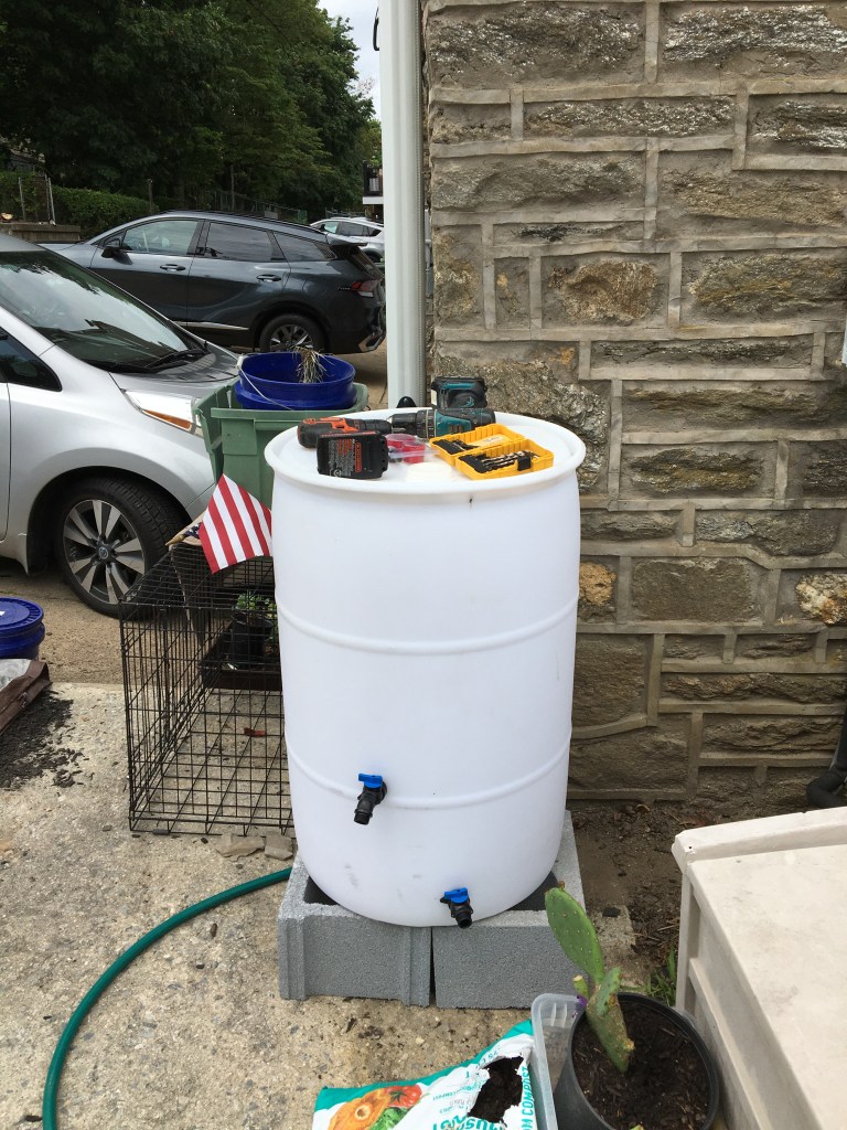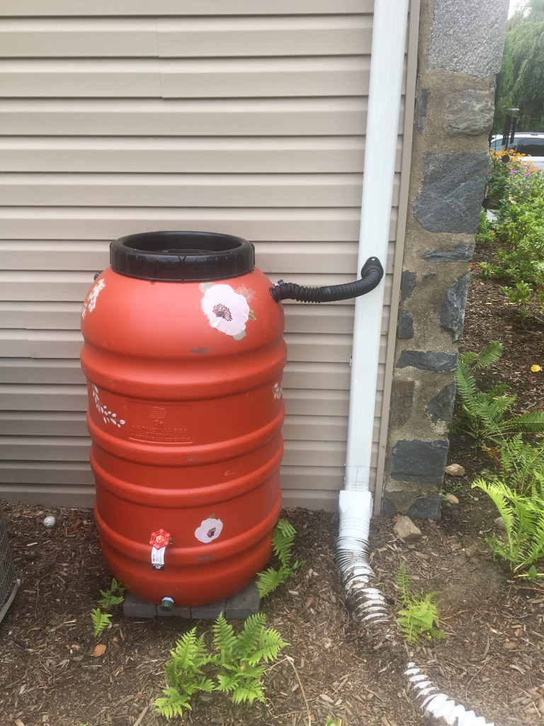 Installed Homeowner provided rain barrel Installed rain barrel spigots to recycled vinegar barrel and installed for homeowner Mini rain garden at end of downspout drain with gravel, border masonry and lamium, lemon balm and sweet woodruff
